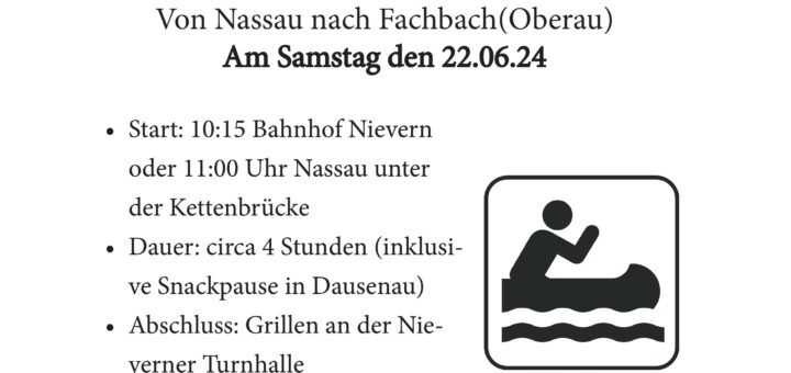 Ein weiteres Angebot im Jubiläumsjahr ist die Kanutour auf der Lahn. Die Fahrt wird am 22.06. von Nassau nach Fachbach (Oberau) gehen und dauert ca. 4 Stunden. Start ist entweder am Nieverner Bahnhof um...