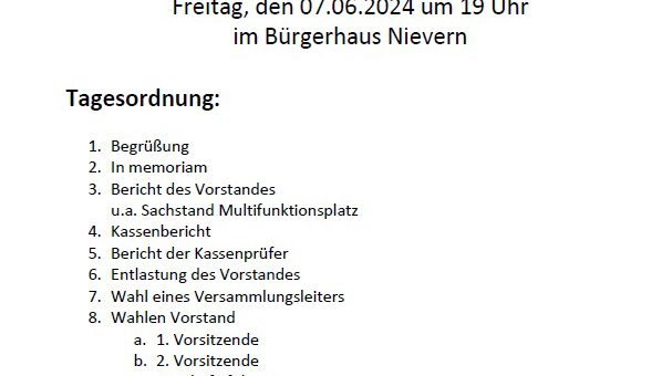 Am Freitag den 07. 06.2024 trafen sich die Mitglieder des Nieverner Turnvereins zu der Mitgliederversammlung im Bürgerhaus. Der 1. Vorsitzende Stefan Salzmann berichtete, dass die Zuschüsse für den geplanten Bau des Multifunktionsplatzes bewilligt wurden....