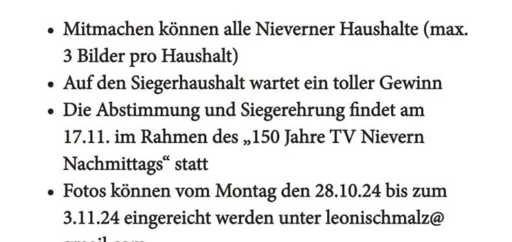 Vom 28.10. bis 03.11. können alle Nieverner Haushalte bis zu 3 Bilder an leonischmalz@gmail.com senden. Egal ob gruselige Kostüme oder schaurige Deko im oder ums Haus. Im Rahmen unserer Abschlussveranstaltung zur 150 Jahrfeier am...